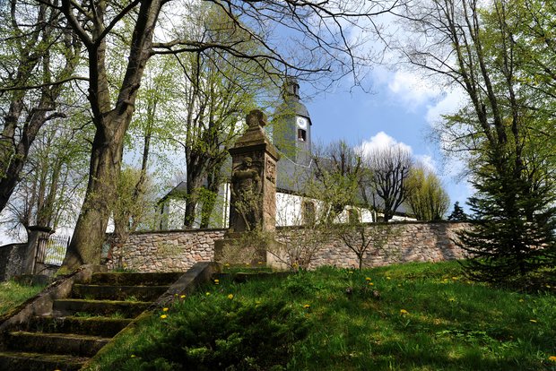 Burkersdorf – Das idyllische Waldhufendorf ist geprägt von traditionellen Bauernhöfen und Gewerben. Die Kirche des Ortes mit ihrer prachtvollen Innenbemalung ist eine der schönsten der Region.