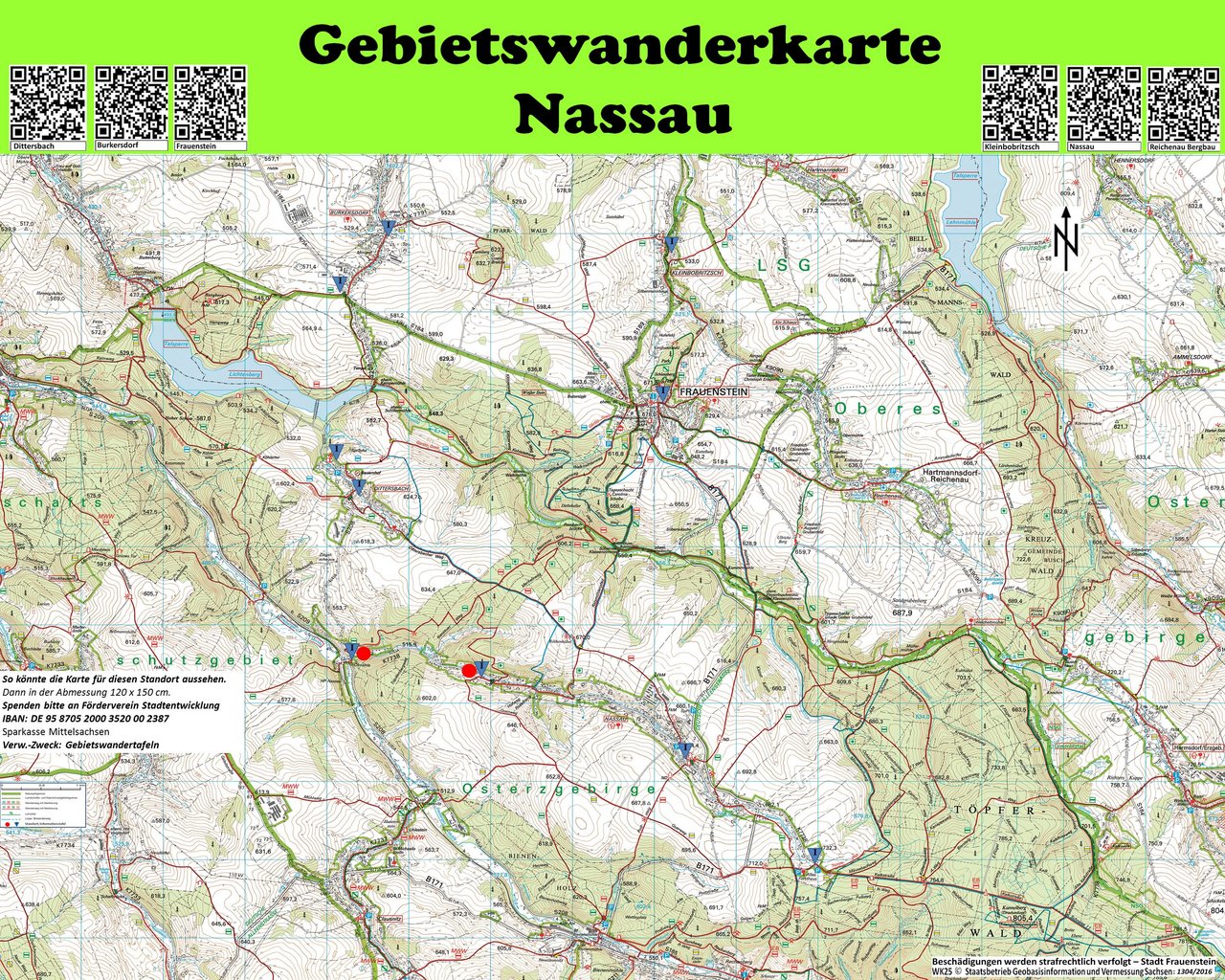 Man findet diese Gebietswandertafel in Burkersdorf am Bushäuschen an der S184 und neben der Post-Gaststätte, in Dittersbach an der Buswendeschleife und am Wanderparkplatz, in Frauenstein am Rathaus und in Kleinbobritzsch am zentralen Dorfplatz. In Nassau stehen die Tafeln am Parkplatz zum Skigebiet "Altes Forsthaus", unterhalb der Silbermannkirche, nahe dem Waldwärterhaus an "Nassauer Weg" und am Bushäuschen an der Ölmühle.