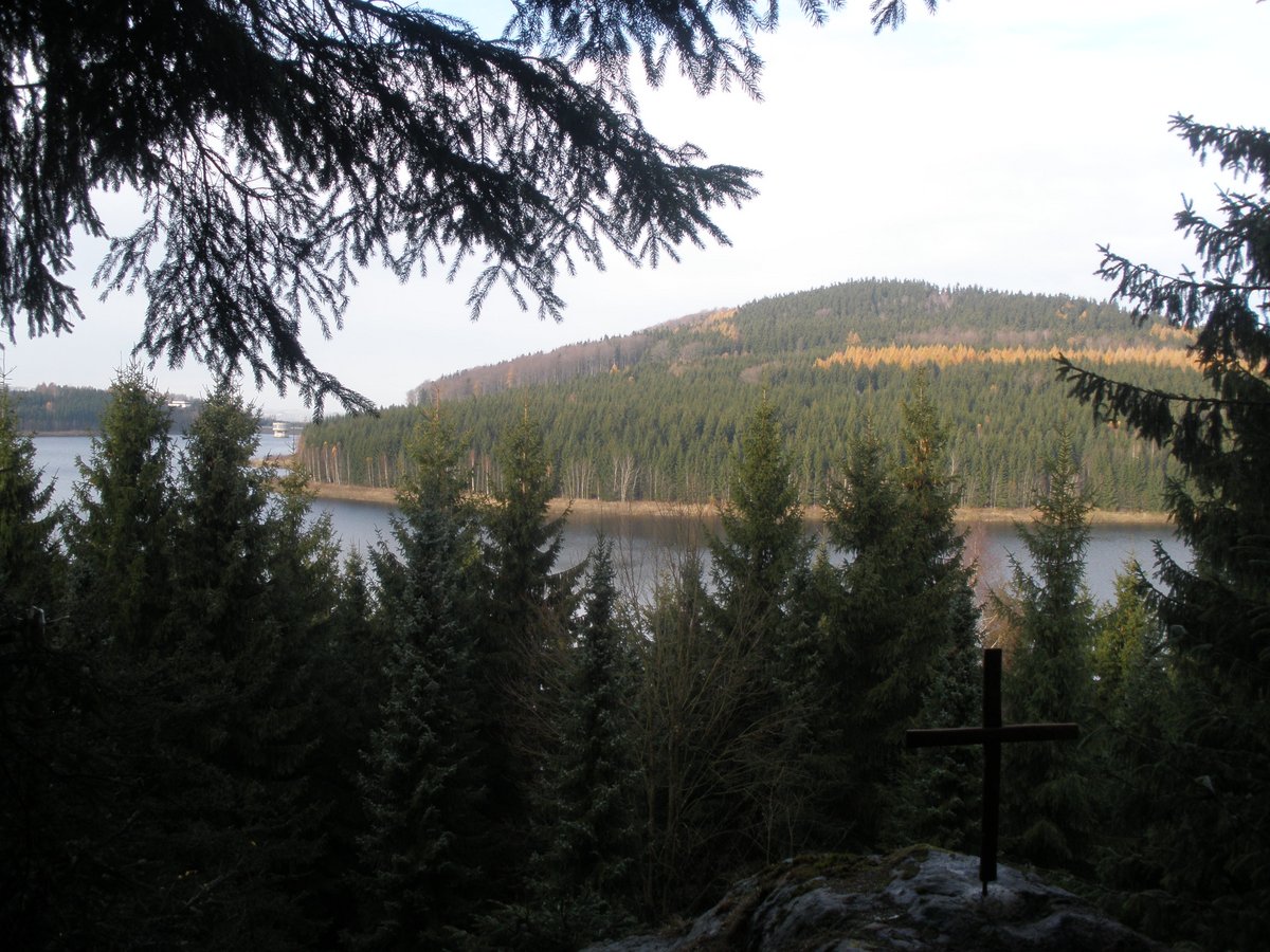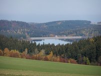 Den Wanderer erwartet ein herrlicher Ausblick auf die Vorsperre der Talsperre Lichtenberg, , die Berge des Erzgebirges und den Sauerberg.