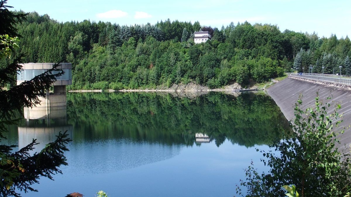 Den Wanderer erwartet ein herrlicher Ausblick auf die Talsperre Lichtenberg, die Staumauer, die Berge des Erzgebirges und den Sauerberg.