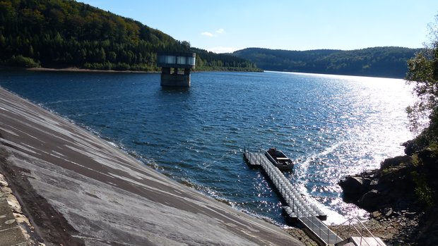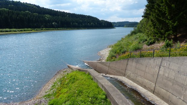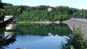 Den Wanderer erwartet ein herrlicher Ausblick auf die Talsperre Lichtenberg und ihre Staumauer.