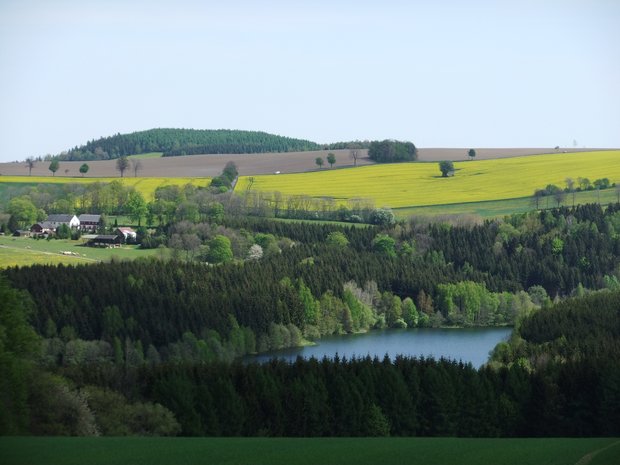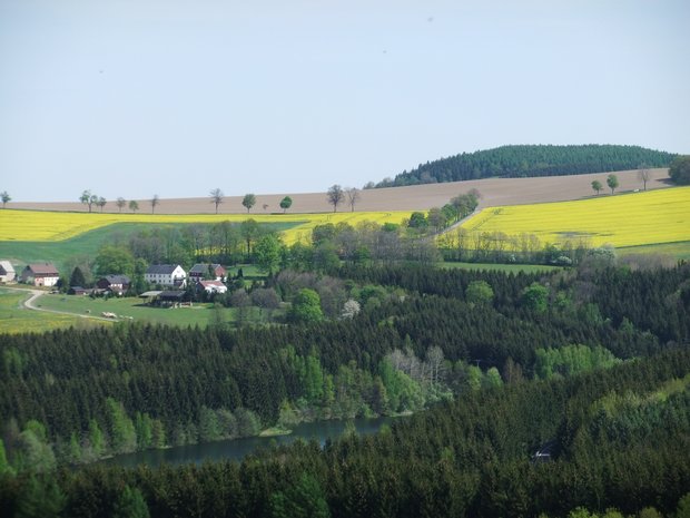 Den Wanderer erwartet ein herrlicher Ausblick auf die Vorsperre der Talsperre Lichtenberg, , die Berge des Erzgebirges und den Sauerberg.